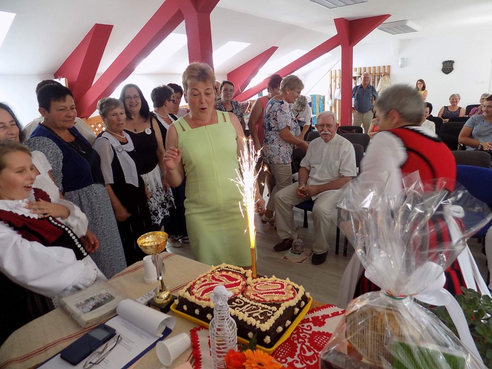 Szép jubileumi rendezvényünk Biszak Enikő megnyitó beszédével kezdődött, aki méltatta a nap jelentőségét, köszöntve a résztvevőket majd én beszámoltam a 10 év tevékenységéről, dióhéjban. Ezután Balázs Ernő elnök úr köszöntötte az egyesületünk tagjait, Gyöngyös Város Barátainak köre nevében. Jánó Kinga szép népdalcsokrával, Kelemen Zsanett, a Nyergestető című Kányádi Sándor verssel tették még szebbé ünnepélyünket. A helyi Önkormányzat és RMDSZ Nőszövetség részéről Fejér Melinda köszöntött és gratulált munkánkhoz, majd civil egyesületek részéről Ráduly Attila, Aurelia Vinkler, Suto Maria Rita, Szőcs Piroska, László Károly, Pap Eszter Edina és Bartha Zsófia. Papp Gizella és Vass Ágnes is ajándékokkal leptek meg. Miután mi is emléklapokat adtunk át a köszöntőinknek, meghitt pillanat következett: kezünket összefogva, együtt énekeltük az Összetartozunk című dalt. Süteményeinkkel kináltuk a kedves vendégeinket, majd megtekintették a kiállításunkat, amelyen munkáinkból adtunk ízelítőt: Ibolya Sylveszter, Mária Kanabé, Lia Vargyasi, Gál Iringó, Ibolya Barabas és én. Nézegethettek 7 képesalbumot, sok fotót tevékenységeinkről, zászlóinkat, népművészeti katalógusokat, amelyben pár munkánk is helyet kapott.