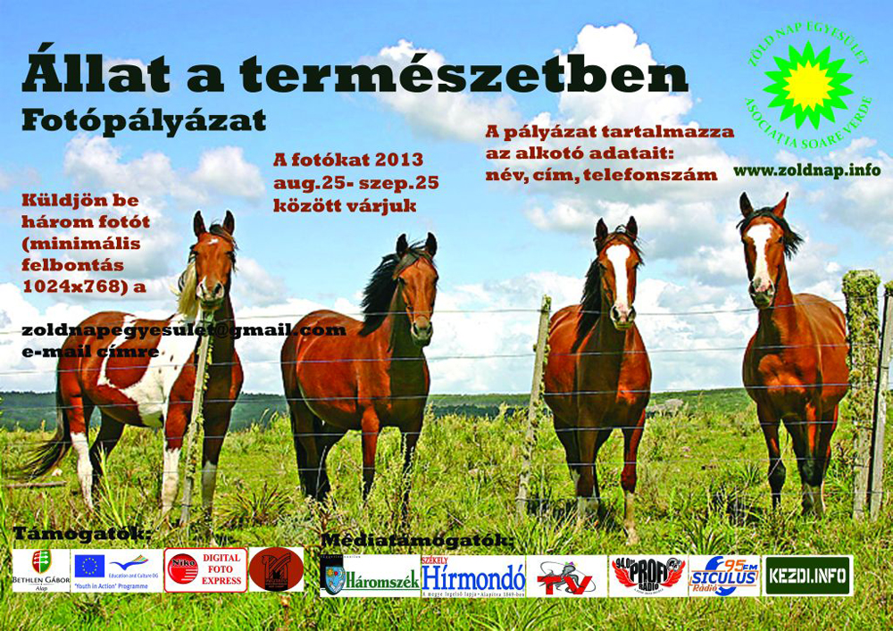 A Zöld Nap Egyesület augusztus közepén hetedik alkalommal hirdeti meg az elmúlt években sikert aratott fotópályázatát. A pályázat címe Állat a természetben, a nyertes alkotásokból 2014-es forgatható falinaptár készül.
