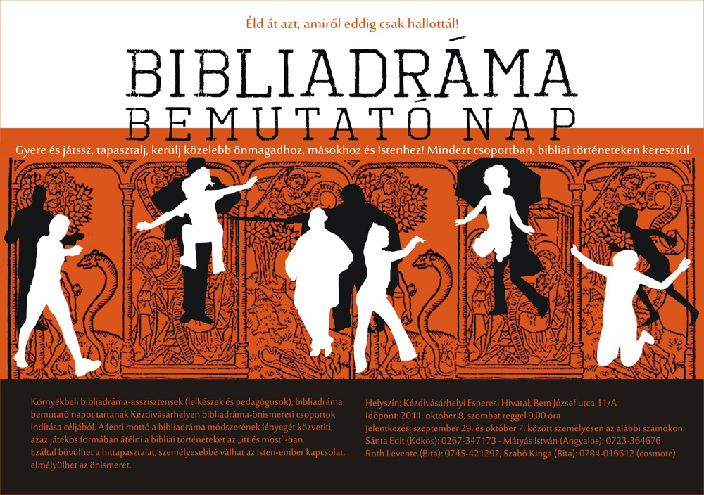 Környékbeli bibliadráma-asszisztensek (lelkészek és pedagógusok), bibliadráma bemutató napot tartanak Kézdivásárhelyen bibliadráma-önismereti csoportok indítása céljából. A fenti mottó a bibliadráma módszerének lényegét közvetíti, azaz játékos formában átélni a bibliai történeteket az "itt és most"-ban. Ezáltal bõvülhet a hittapasztalat, személyesebbé válhat az Isten-ember kapcsolat, elmélyülhet az önismeret.