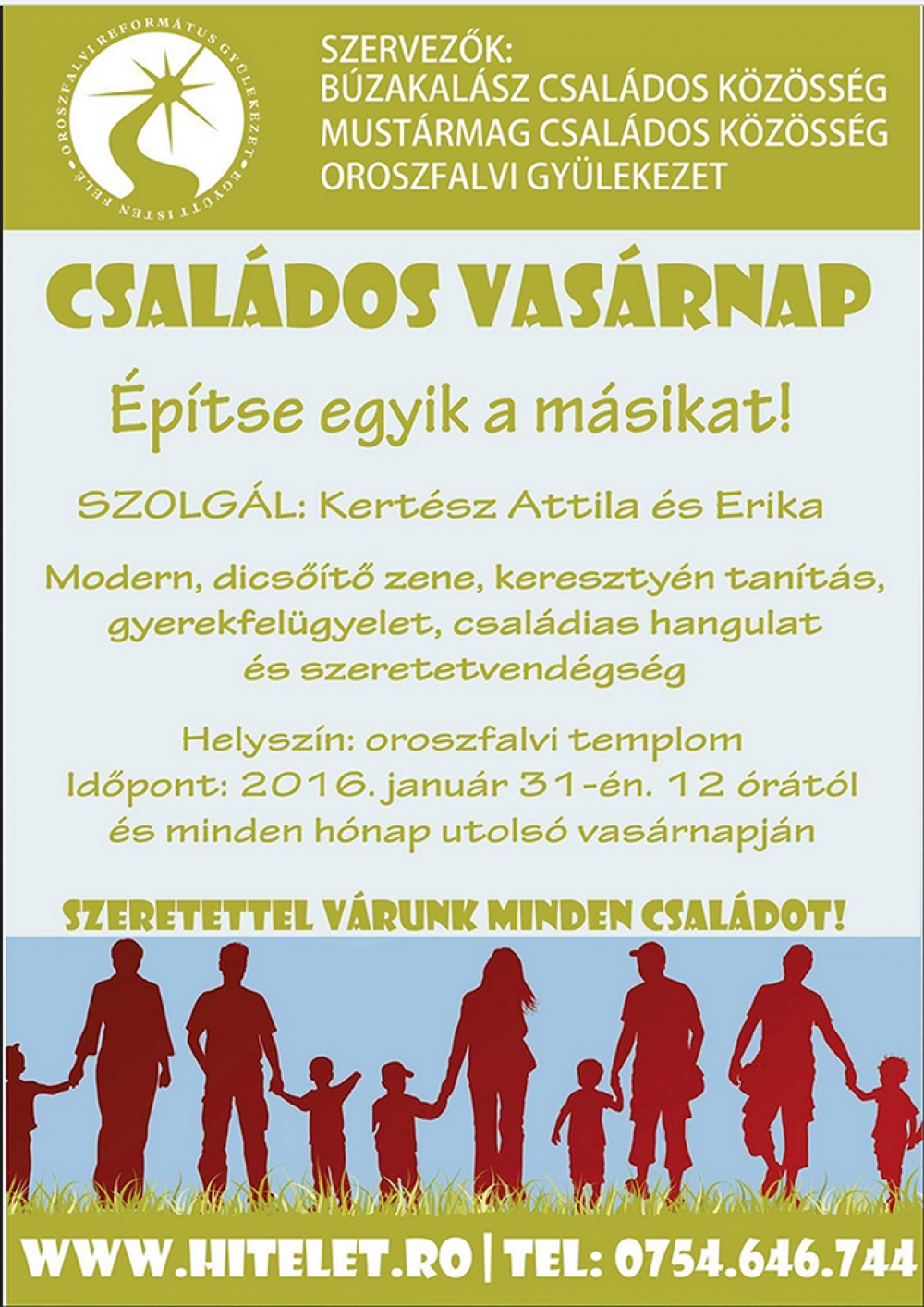 2016. január 31.-én l2 órától és minden hónap utolsó vasárnapján, az oroszfalvi templomban Családos Vasárnapot tartanak, Építse egyik a másikat témakörben!