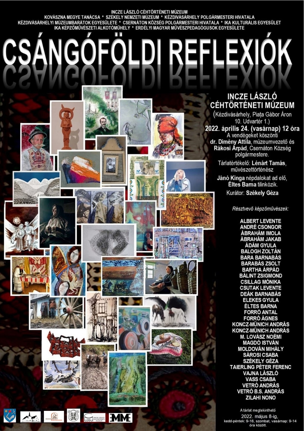 A csernátoni IKA Képzőművészeti Alkotóműhely, az Erdélyi Magyar Művészpedagógusok Egyesülete (EMME), valamint az Incze László Céhtörténeti Múzeum tisztelettel meghívja a kézdivásárhelyi múzeumban 2022. április 24-én, vasárnap 12 órakor sorra kerülő Csángóföldi reflexiók