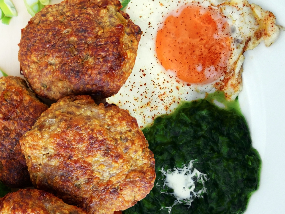 Spenótfőzelék, tükörtojás, fasírt