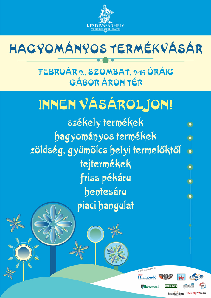 Februári hagyományos termékvásár - A nagyszámú érdeklődő, a jó eladás és a helyi termelők részvétele azt mutatja, hogy van igény a havi hagyományos termékek vásárára. Ennek apropóján az év második termékvására február 9-én, szombaton, 9 órától lesz a Gábor Áron téren. Egyre több árus jelzi, hogy szívesen megkóstoltatná termékét a kézdivásárhelyi vásárlókkal, a februári vásárra közel 35 termelő jelentkezett. A kézdivásárhelyi Nők Egyesülete ezúttal is adományként ajánlja fel a házi készítmények bevételének összegét, húsvétra árva gyerekeknek vásárolnak belőle ajándékot.Szeretettel várunk minden kedves vásárlót!A termékvásár szervezői: Kézdivásárhely Polgármesteri Hivatala, a Kovászna Megyei Agrárkamara és Kovászna Megye Tanácsa.