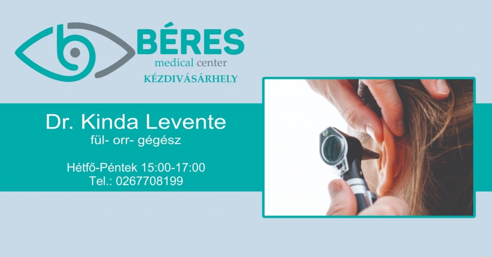 Dr Kinda Levente fül- orr-gégész főorvos minden délután fogadja az érdekelteket a Béres Medical Centerben. A járványügyi előírásokat betartva előzetes előjegyzéssel torténik a vizsgálat. Az Ön védelme a mi egészségünk!