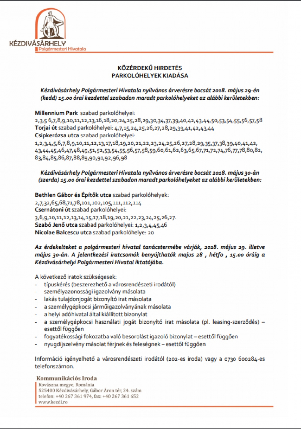 Az érdekelteket a polgármesteri hivatal tanácstermébe várják, 2018. május 29. illetve május 30-án. A jelentkezési iratcsomók benyújthatók május 28 hétfő, 15.00 óráig a Kézdivásárhelyi Polgármesteri Hivatal iktatójába. A következő iratok szükségesek: - típuskérés (beszerezhető a városrendészeti irodától) - személyazonossági igazolvány másolata - lakás tulajdonjogát bizonyító irat másolata - a személygépkocsi járműigazolványának másolata - a helyi adóhivatal által kiállított bizonylat - a személygépkocsi használati jogát bizonyító irat másolata (pl. leasing-szerződés) – esettől függően - fogyatékossági fokozatba való besorolást igazoló bizonylat – esettől függően - nyugdíjszelvény másolat férjnek és feleségnek – esettől függően Információ igényelhető a városrendészeti irodától (202-es iroda) vagy a 0730 600284-es telefonszámon.