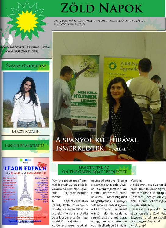 A Bíró Levente által szerkesztett kiadványból az olvasók megtudhatják, hogy az évszak legaktívabb önkéntese Derzsi Katalin lett. Ezúton is tagság gratulál neki. Megtudhatjuk az Emmanuelle Baillet-el készült interjúból, hogy miért vállalkozott önkéntességre Romániában, illetve, hogy miért éppen a Zöld Nap Egyesületet választotta fogadó szervezetként. Csillag Judit ZNE önkéntes tollából rövid, szakszerű összefoglalót olvashatunk az energiafûzrõl. Az olvasó betekintést nyerhet a március 15-én, Lisznyóban szervezett ünnepségről. De beszámolnak a zöldek az oktatási intézményekbe szervezett előadásokról is.