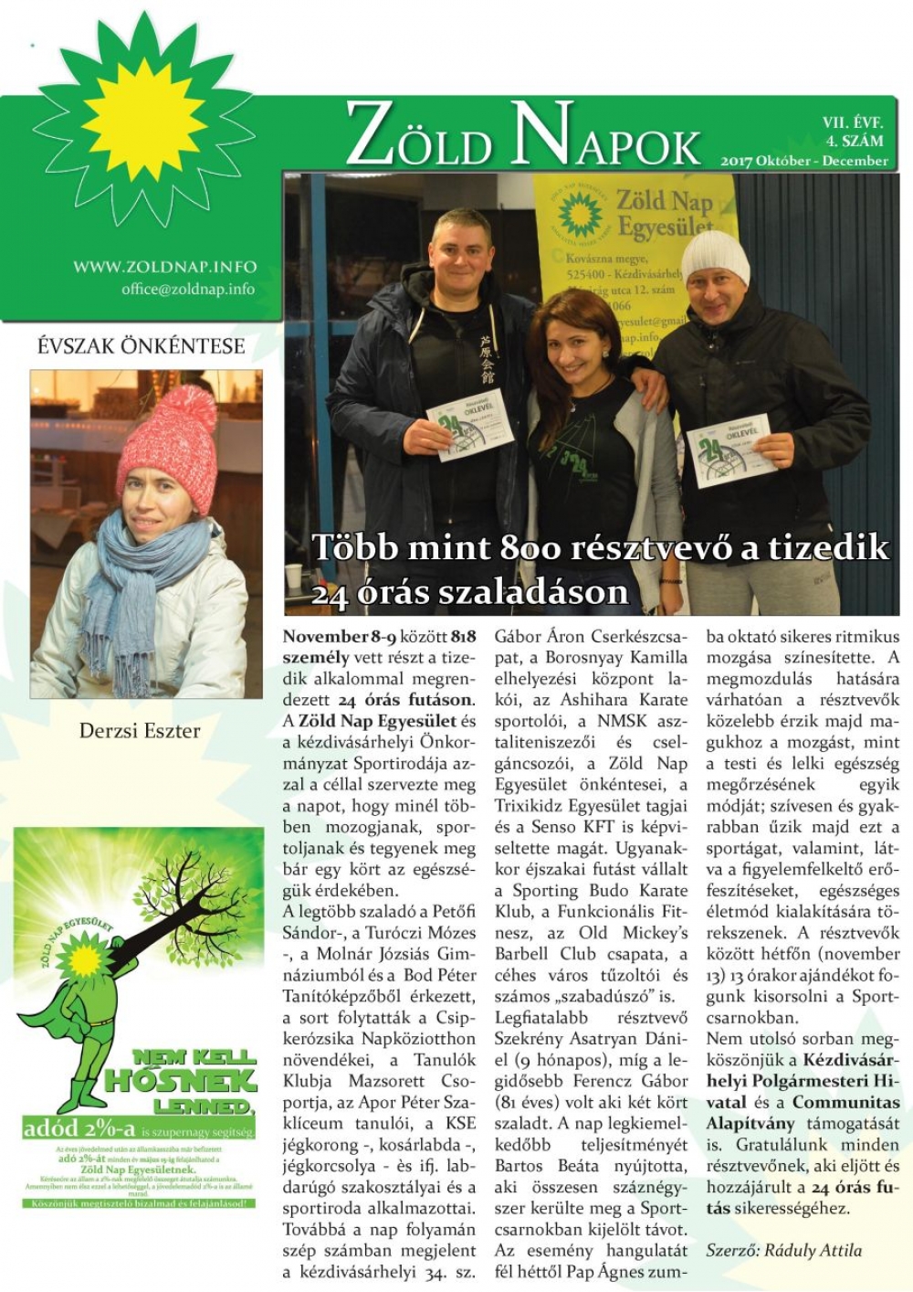 Megjelent a Zöld Nap Egyesület negyedik és egyben a 2017-es évet záró újságja. Elsőként Derzsi Eszter személyében, megismerhetjük az évszak önkéntesét. Ezt követően tájékozódhatunk az egyesület őszi évadjának gazdag tevékenységeiről, éspedig az egyre nagyobb sikernek örvendő 24 órás szaladásról, az Isabel Fernandez által beindított spanyol társalgási klub mozzanatairól, a török nemzeti est, a Mozgó délután, a borvizeinket népszerűsítő, valamint a Lettországban sorra került kilenc napos továbbképzésről. Továbbá olvashatunk a reformáció 500 éves évfordulójára szervezett faültetési akcióról, a csernátoni csapatépítő tréning eseményeiről, a Kollár-Mécs hegymászó páros, valamint Haykuhi Harutyunyan előadásában az örmény nők a társadalomban bemutatójáról és az Önkéntes Kupán szerzett rangos díjról.