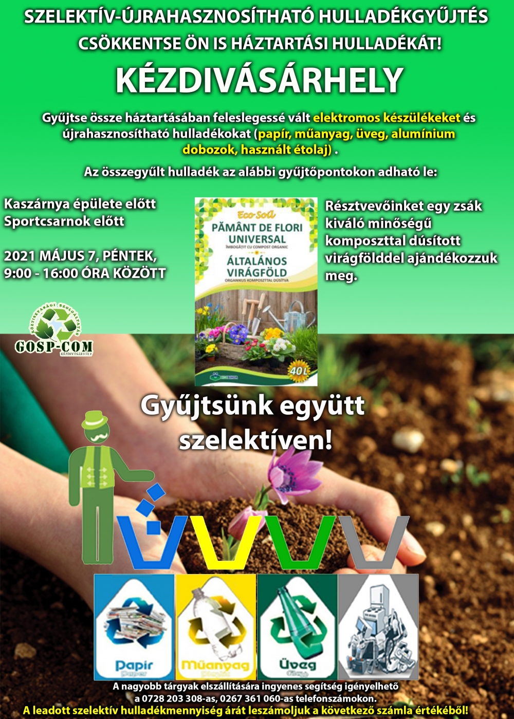 A Gosp-Com Kft. 2021 május 7-dikén szelektív hulladékgyűjtő napot szervez Kézdivásárhelyen pénteken 09:00 - 16:00 óra között a Kaszárnya és a Sportcsarnok előtt.