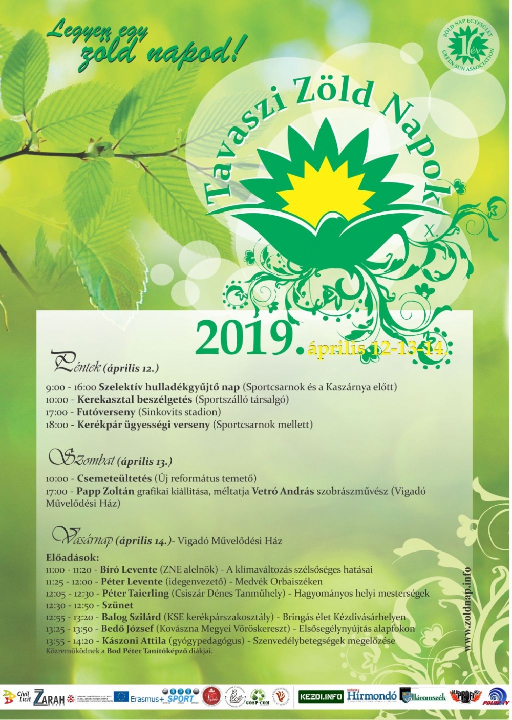 A Zöld Nap Egyesület idén április 12 - 14 között tizedik alkalommal szervezi meg a Tavaszi Zöld Napokat. A három napos rendezvénysorozaton előadásokat, kerekasztal beszélgetést, szelektív hulladék gyűjtést, kiállítást, csemeteültetést szerveznek, de a kikapcsolódásról sem feledkeznek meg, lesz családi futás és kerékpár ügyességi verseny is.