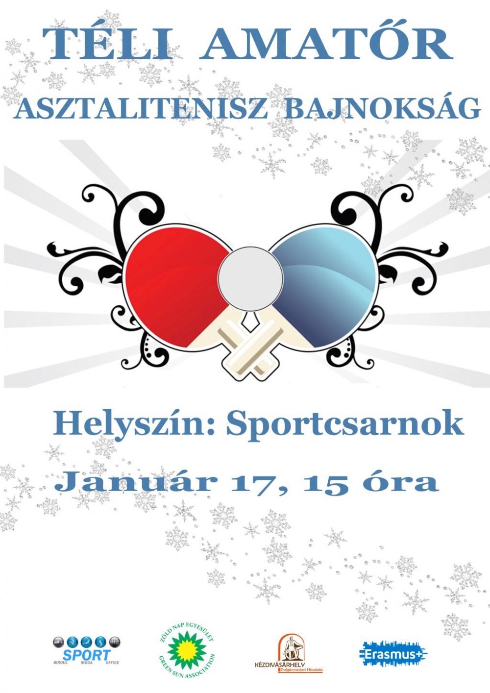 A kézdivásárhelyi Sportiroda és a Zöld Nap Egyesület január 17-én (szerda) 15 órától a céhes városi sportcsarnokban amatőr sportolók számára asztalitenisz bajnokságot szervez. A következő korosztályok jelentkezhetnek: 2011/2010-, 2009/2008-, 2007/2006-, 2005/2004-ben születettek, valamint az ifjúsági korosztály és a felnőttek. A fiúk és a lányok külön kategóriában szerepelnek, a mérkőzések pedig 6 asztalon fognak zajlani. A versenyre a benevezés ingyenes. A résztvevőknek kötelező sportcipőt és pingpong ütőt hozniuk. A bajnokság végén ünnepélyes eredményhirdetésre kerül sor, a legjobbak díjazásra is kerülnek!